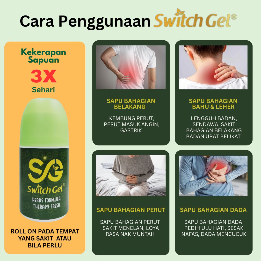 Switch Gel direka dengan formulasi "Water Based" & bio-teknologi yang pantas menyerap ke dalam kulit dan terus bertindak dari dalam untuk membantu proses pemulihan dan menstabilkan asid dalam perut.