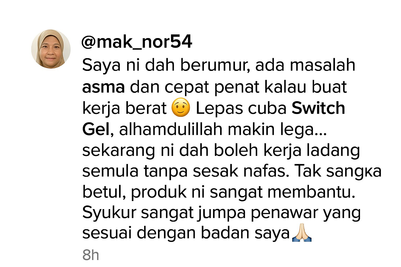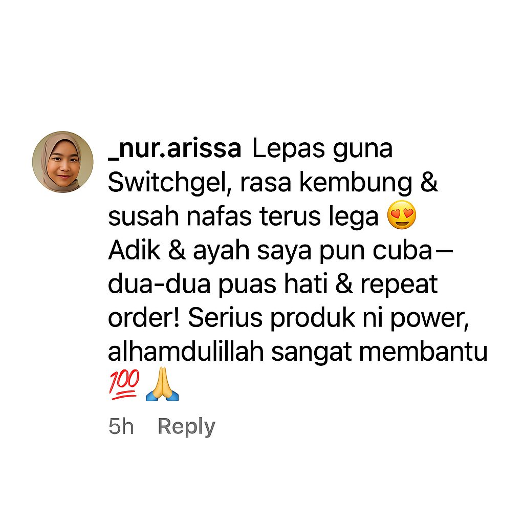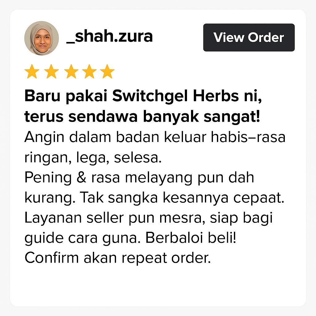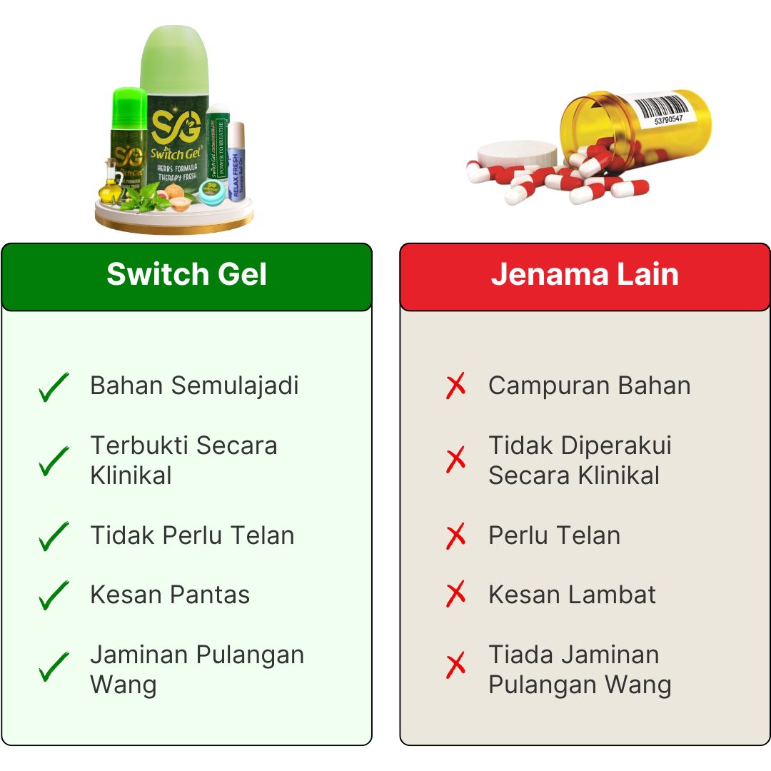 Ya, Switch Gel diperbuat daripada 100% herba semulajadi dan halal — boleh digunakan tanpa ragu untuk solat dan ibadah.
